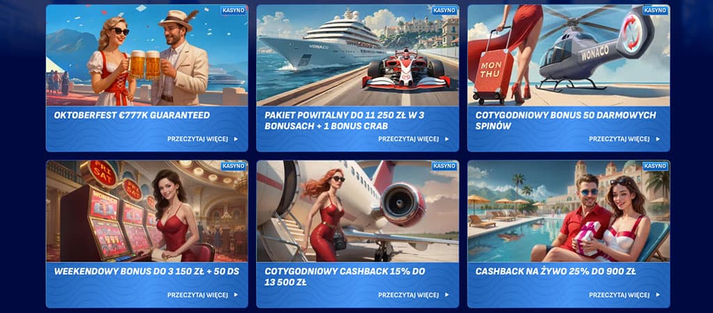 Na pierwszy rzut oka w Wonaco Casino imponuje nam wybór bonusów. Jako mniej znane casino, platforma posiada bardzo dobrą jakość grafik, strony internetowej i przede wszystkim wybór bonusów za pomocą komfortowych i czytelnych kafelków. Co więcej, wszelkie spersonalizowane bonusy kasyna są prezentowane z opcją tłumaczenia za poszczególne języki świata,w tym nawet po Polsku.